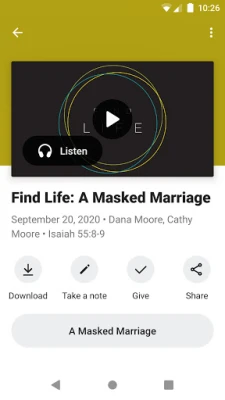 - Weekly Service Live & On Demand - Watch or listen to past messages (Downloadable to take them on the go) - Resources to help you grow closer to Jesus (Videos, Bible reading plan, Articles) - Stay up-to-date with Push Notifications - Sign up for events - Make a secure gift